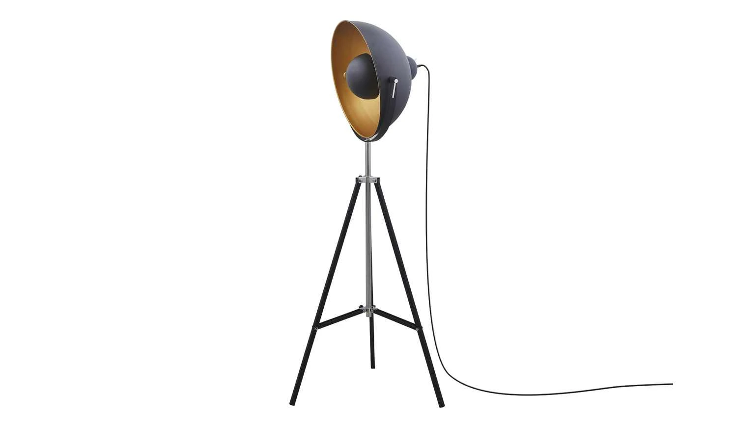 Sorgen Sie für stimmungsvolles Ambiente mit der Dreibein-Stehleuchte von HOME STORY. Die goldfarbene, matte Innenseite des Lampenschirms macht die Stehlampe im Industrial-Style zu einem echten Eyecatcher. Genießen Sie das besondere Lichtspiel und erschaffen Sie ein einzigartiges Ambiente: Der Lampenschirm lässt sich dazu ganz leicht drehen und schwenken. Der große Lampenschirm mit ganzen 50 Zentimetern Durchmesser ist an der Außenseite mattschwarz lackiert und besitzt einen dezenten Kippschalter an der Rückseite. Die 165 Zentimeter hohe Studiolampe steht auf einem mattschwarzen Metallstativ und erinnert an Scheinwerferlampen in Fotostudios.