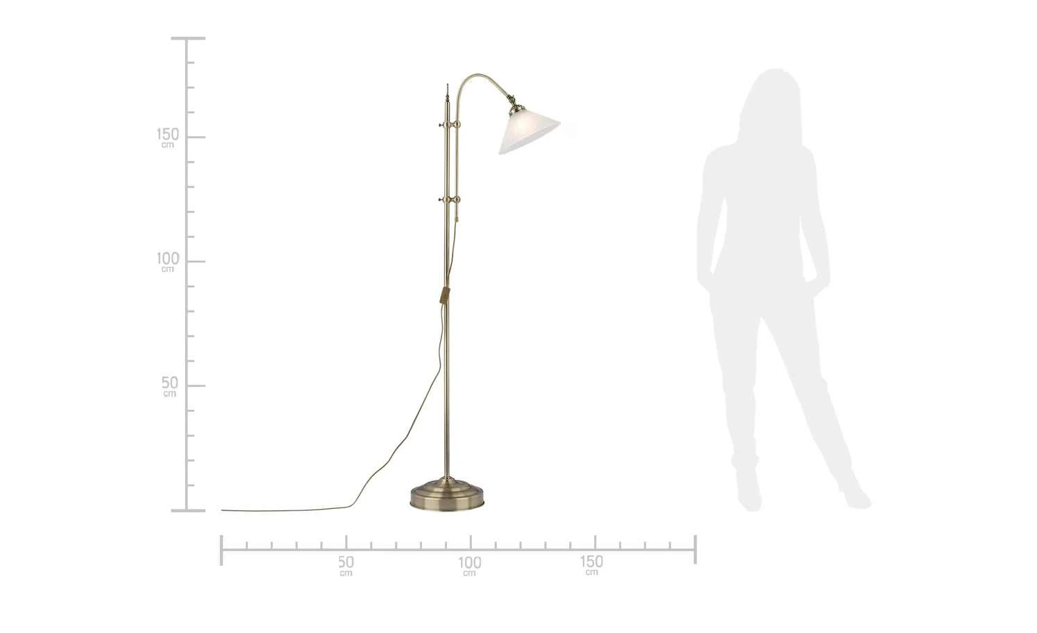 Mit dieser einflammigen Stehleuchte erwerben Sie nicht nur ein Accessoire, das jederzeit für ein angenehmes Licht in Ihren Arbeits- und Wohnräumlichkeiten sorgt. Die Leuchte in klassischem Design fügt sich auch als dekorativer Blickfang in Ihre Einrichtung ein. Das Messinggestell stellt dabei einen harmonischen Kontrast zum alabasterfarbenen Schirm dar und rundet das attraktive Bild ab.