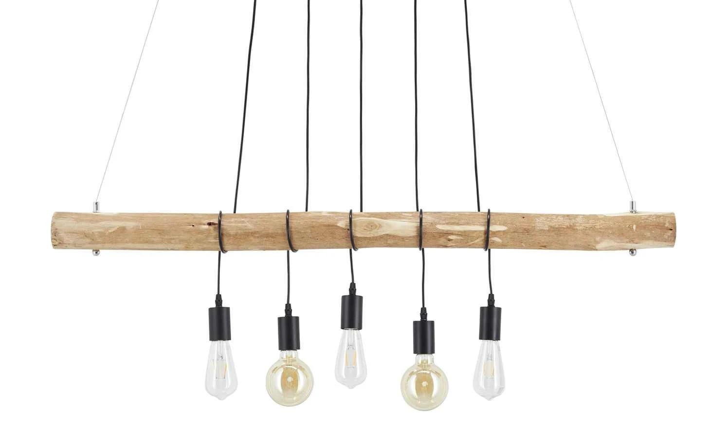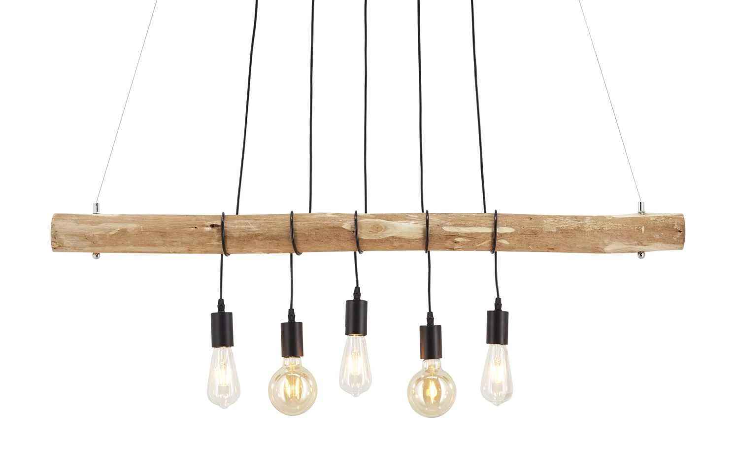 Diese charakterstarke Pendelleuchte wurde vom innovativem Familienunternehmen Paul Neuhaus designt. Gleich fünf Lampenfassungen hängen mit etwas Abstand zueinander von einem Holzstück aus bearbeitetem Eukalyptusholz. Dadurch wirkt die Pendelleuchte nicht nur natürlich, sondern erhält auch einen leicht maritimen Touch.