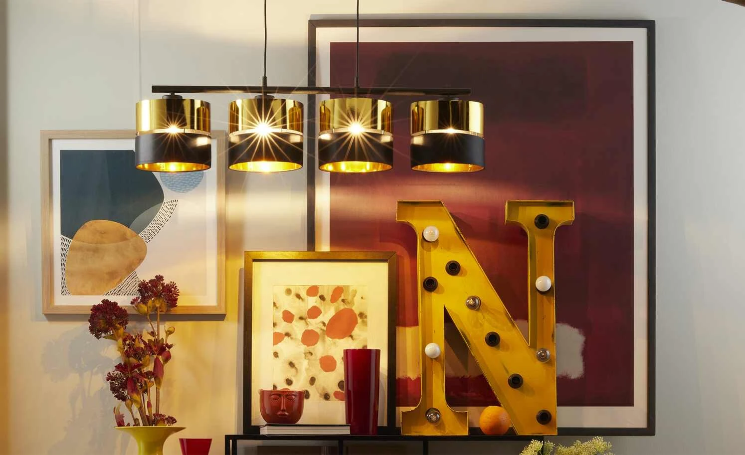 Pendelleuchte, 4-flammig, Schwarz/goldfarben