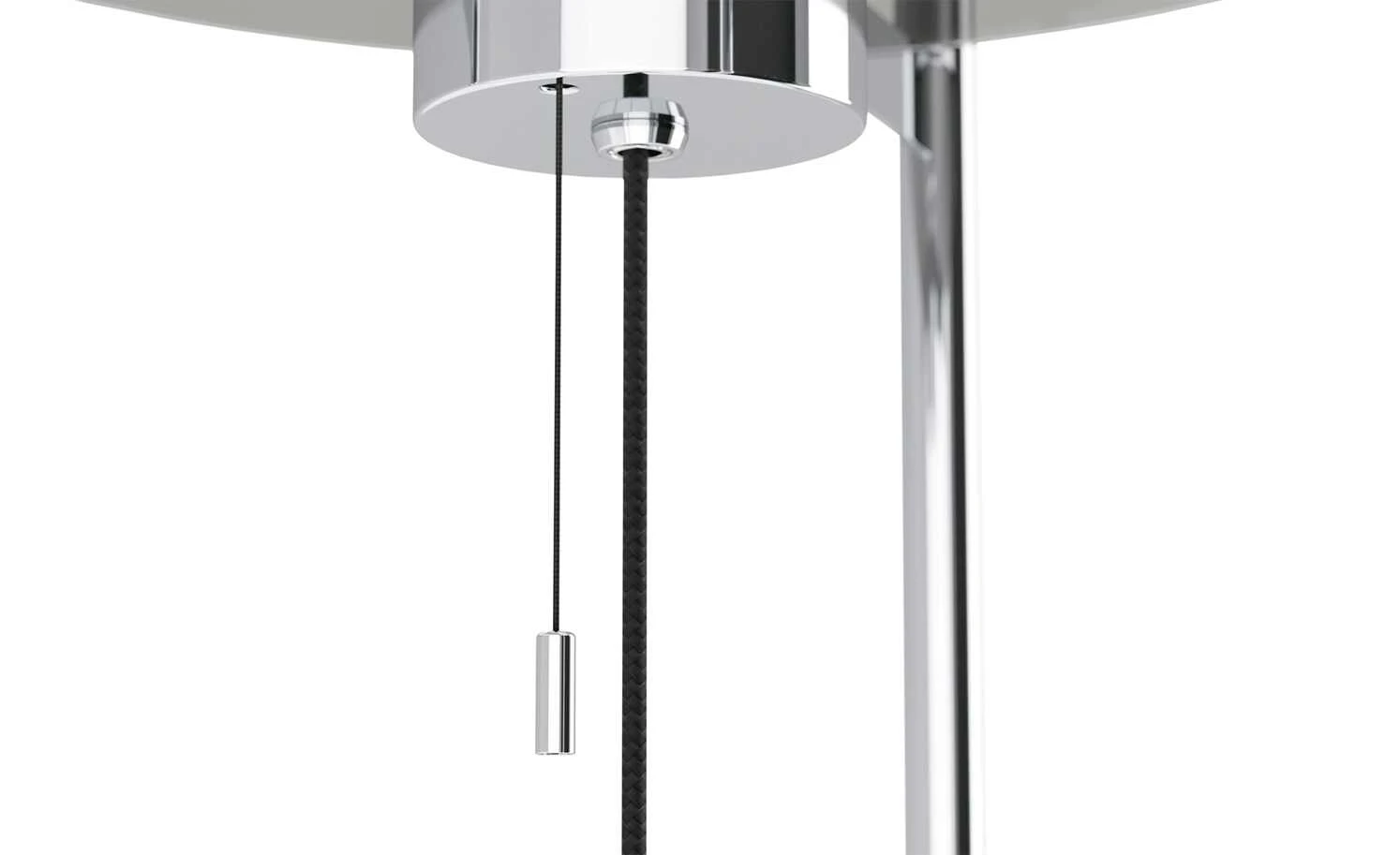 - Mehr zum Material: Metall-Untergestell in Chrom-Optik, runder Fumé-Glasschirm aus Borosilikatglas