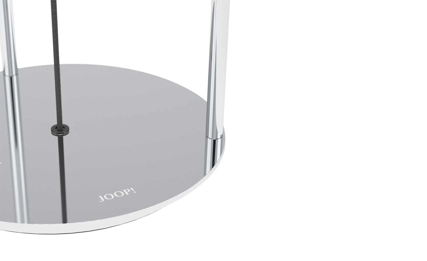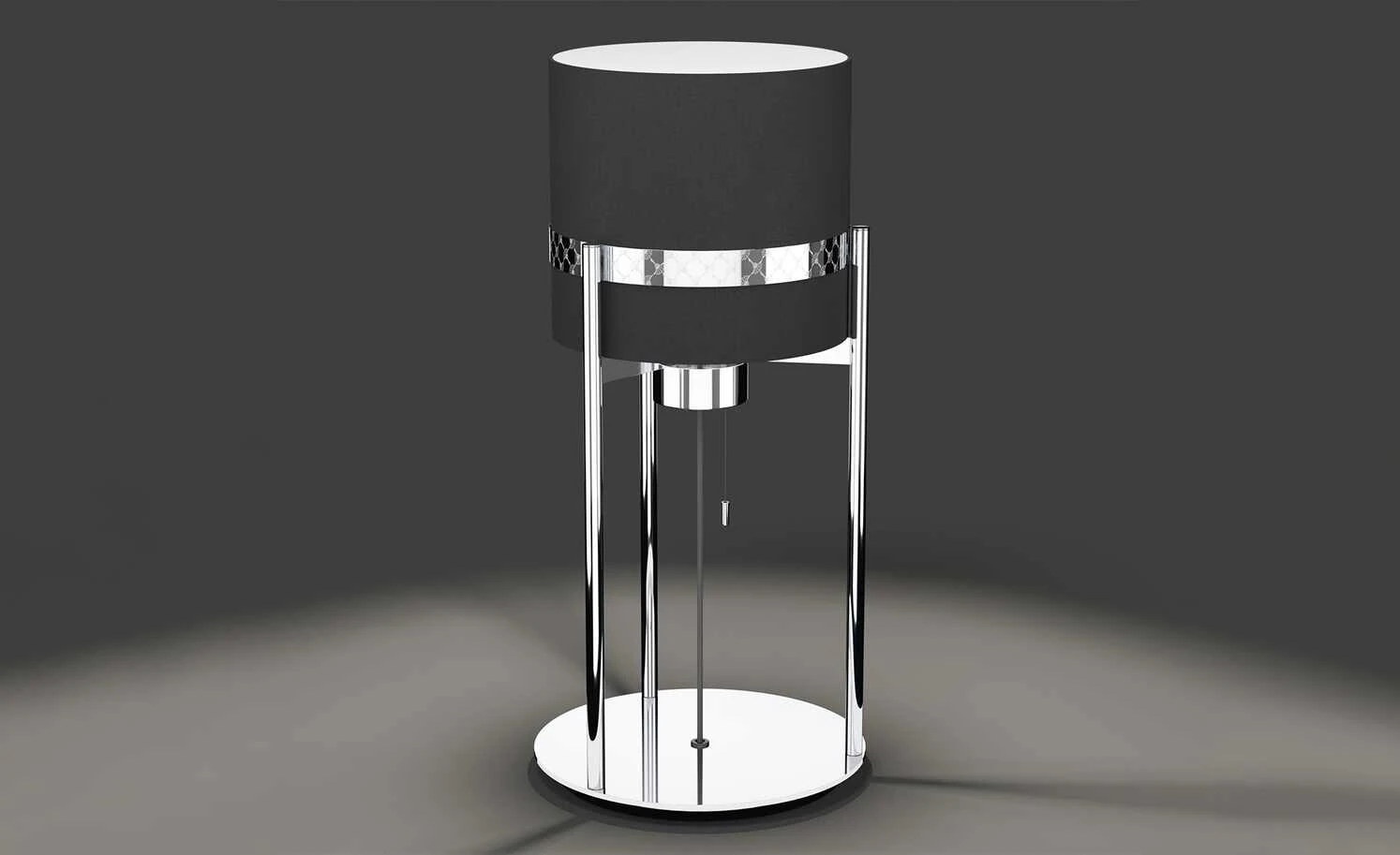 - Mehr zum Material: runder Textil-Leuchtenschrim in Schwarz mit Dekorband, rundes Metallgestell in Chrom-Optik