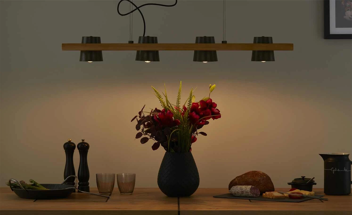 Trio Pendelleuchte, 4-flammig, Nickel antik mit Pinienholz