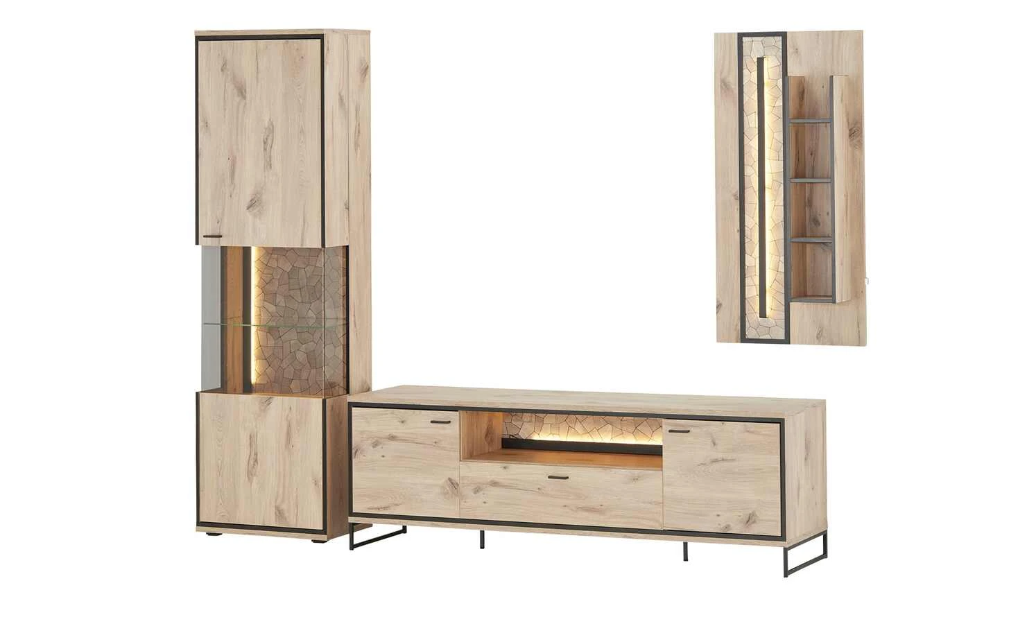- Lieferumfang / mitgeliefertes Zubehör: 2er LED-Profilbeleuchtung ca. 60 cm mit 200 cm Kabel mit Trafo und Zuleitung für Vitrine, LED-Profilbeleuchtung ca.60 cm mit 200 cm Kabel mit Handschalter, Trafo und Zuleitung für TV-Element, LED-Paneelbeleuchtung ca. 100 cm mit 200 cm Kabel mit Trafo und Zuleitung für Wandregal
